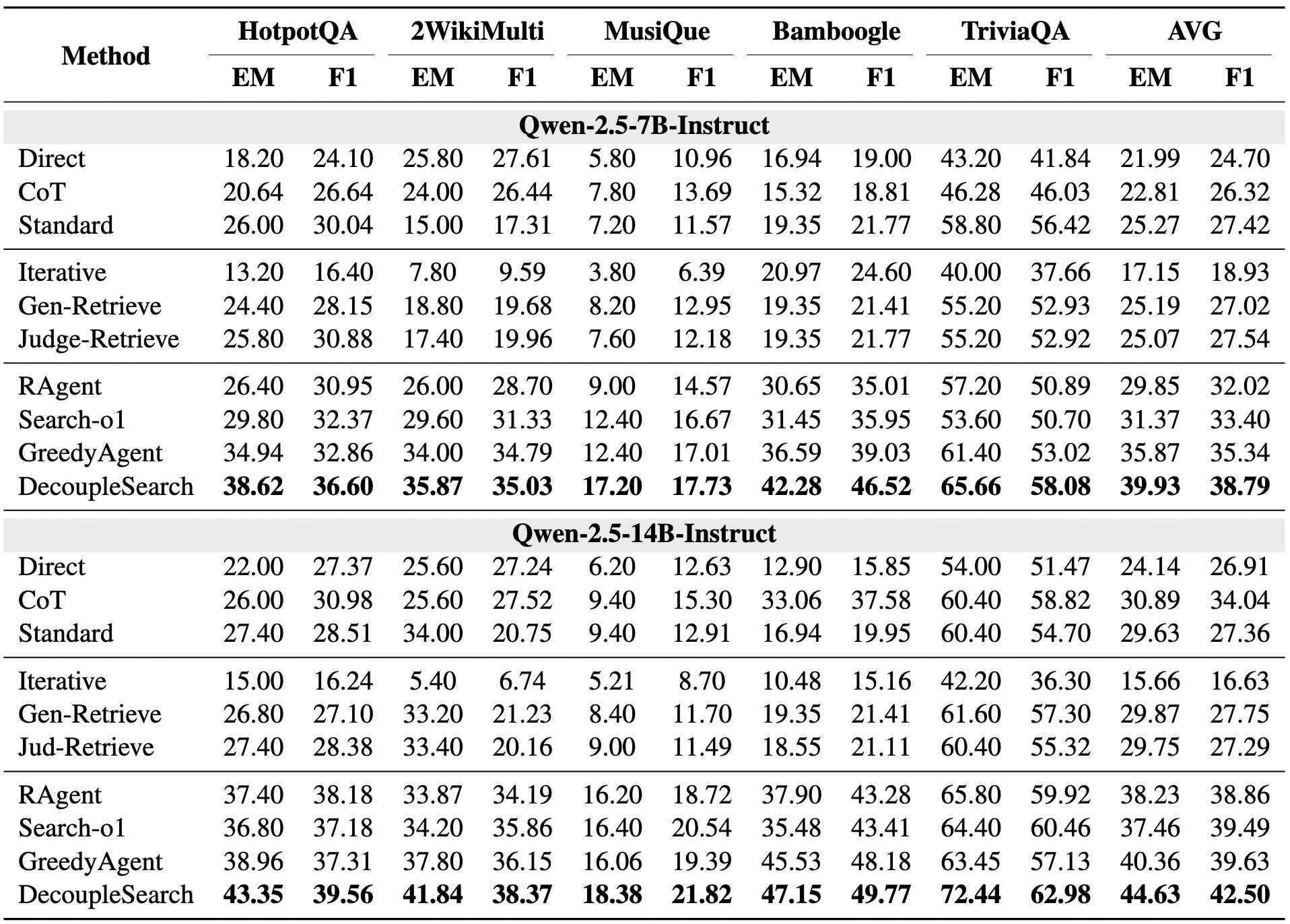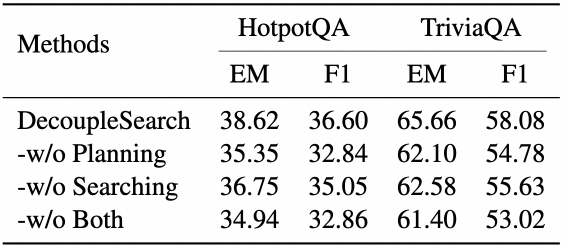 First, our method achieves superior performance on all datasets across different policy models. Notably, with Qwen2.5-7B-Instruct-1M as the policy model, DecoupleSearch achieves a 25.8% relative average improvement over the best-performing baseline. This improvement is attributed to the combined planning and searching beam search, which thoroughly explores both spaces and significantly increases the likelihood of identifying the correct reasoning path.