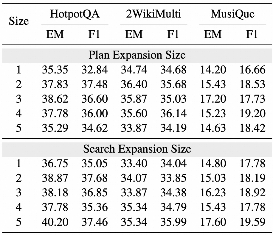 Scaling with Planning and Searching We conduct experiments on the HotpotQA, 2WikiMultihopQA, and MusiQue datasets, varying these parameters within the range of 1 to 5.