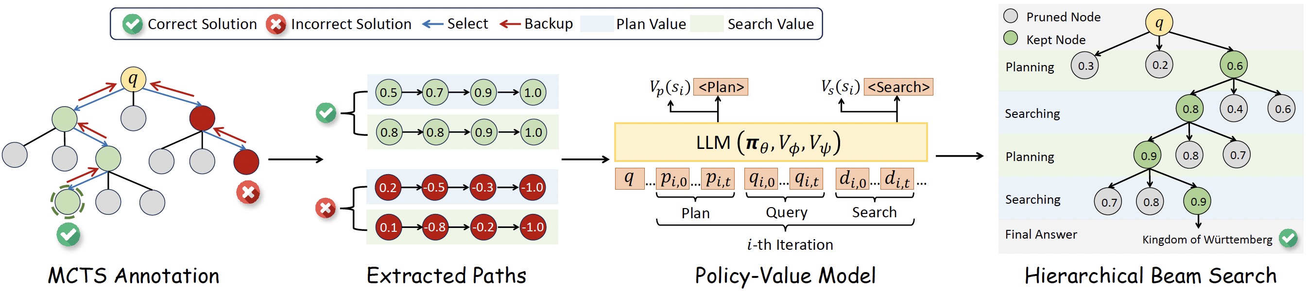 Hierarchical Beam Search At each step, the policy model first samples multiple possible plans, which are ranked and filtered by the planning value model.